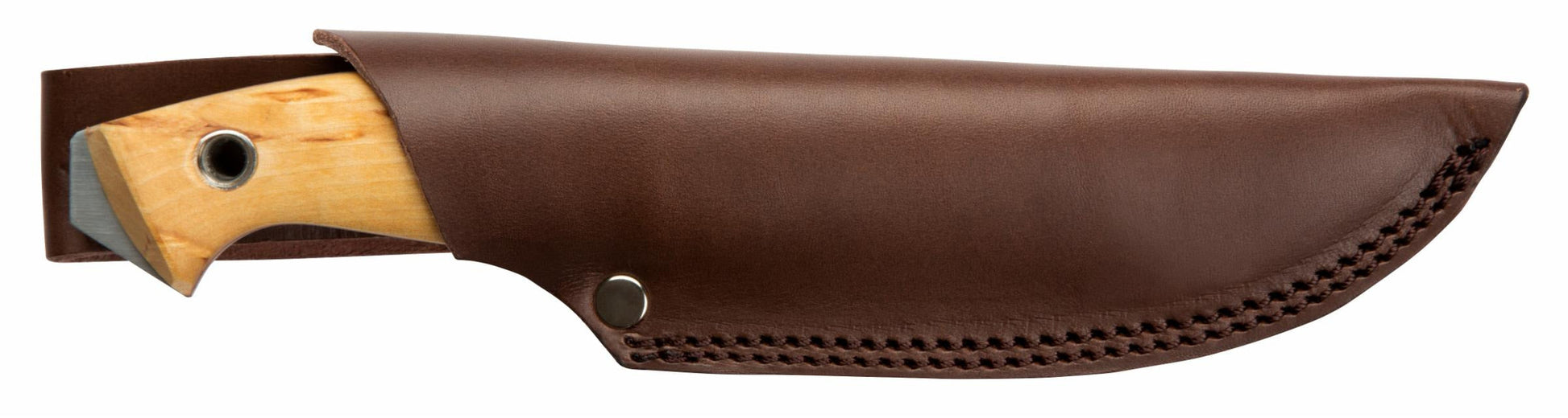 The Utvær is a full tang knife equipped to withstand the demand in traditional Bushcraft use. The scandi grind Sandvik 12C27 steel offers exceptional durability. Thin enough to perform as a knife should when cutting or carving. Two rivets reinforce and hold the hand sanded curly birch handle to the knife. The extended pommel is designed for rougher tasks.
